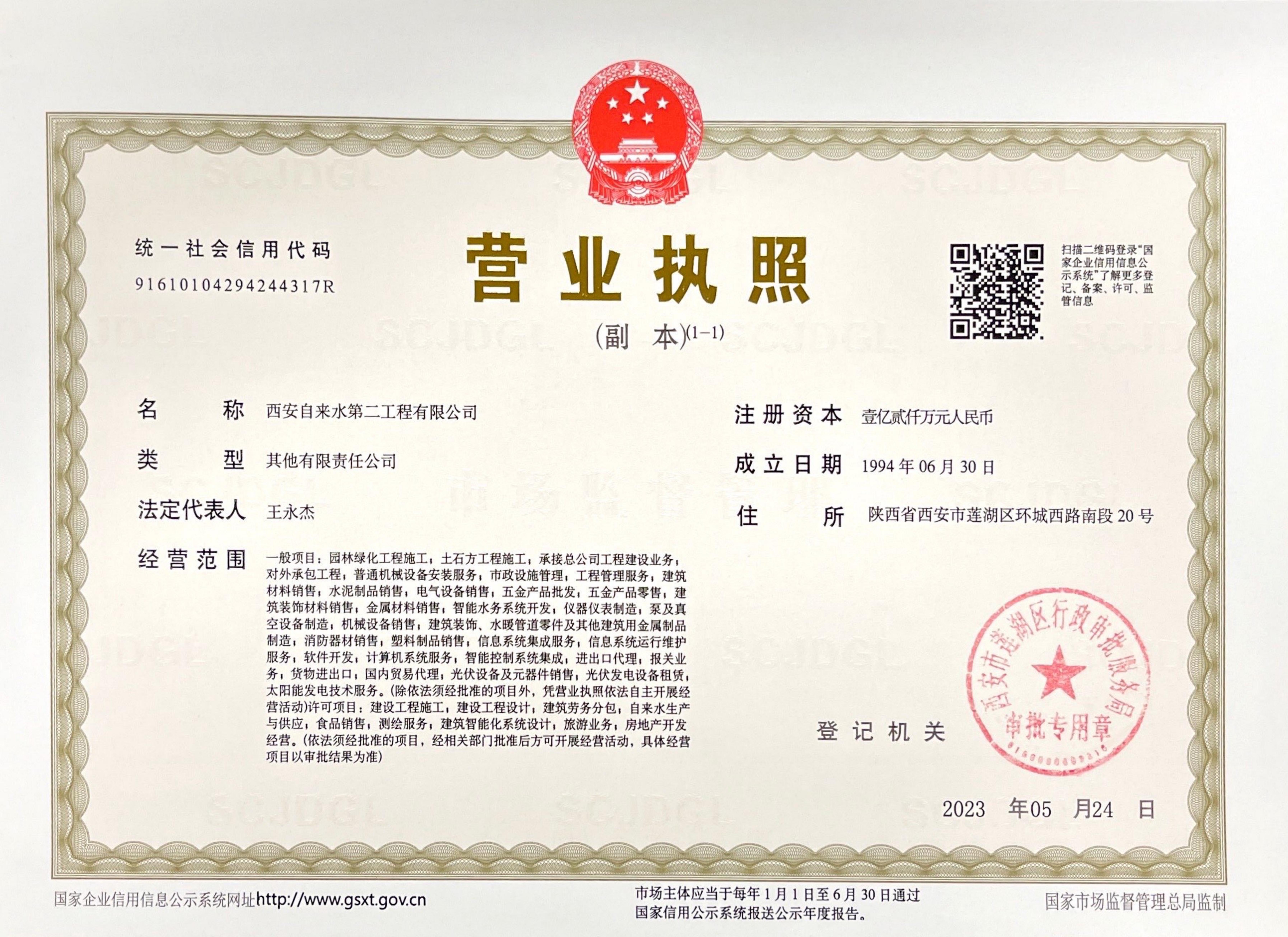 西安自來水第二工程有限公司是西安供水集團下屬的獨立法人單位。公司成立于1994年,注冊資金壹億貳仟萬元?,F有員工180余人,其中具有一級、二級注冊建造師30余人,中、高級職稱人員70余人。經營范圍:一般項目:園林綠化工程施工;土石方工程施工;承接總公司工程建設業務;對外承包工程;普通機械設備安裝服務;市政設施管理;工程管理服務;建筑材料銷售:水泥制品銷售;電氣設備銷售;五金產品批發;五金產品零售;建筑裝飾材料銷售;金屬材料銷售;智能水務系統開發;儀器儀表制造;泵及真空設備制造;機械設備銷售;建筑裝飾、水暖管道零件及其他建筑用金屬制品制造;消防器材銷售;塑料制品銷售;信息系統集成服務;信息系統運行維護服務;軟件開發;計算機系統服務;智能控制系統集成;進出口代理;報關業務;貨物進出口;國內貿易代理;光伏設備及元器件銷售;光伏發電設備租賃;太陽能發電技術服務。許可項目:建設工程施工;建設工程設計;建筑勞務分包;自來水生產與供應;食品銷售;測繪服務;建筑智能化系統設計;旅游業務;房地產開發經營。